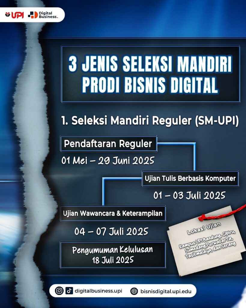 Program Studi Bisnis Digital UPI membuka kesempatan bagi calon mahasiswa melalui dua jalur Seleksi Mandiri, yaitu Seleksi Mandiri Prestasi (SM-PI) dan Seleksi Mandiri Nilai SNBT (SM-SNBT). Berikut ini informasi lengkap mengenai jadwal, lokasi ujian, dan tata cara pendaftaran untuk kedua jalur tersebut: